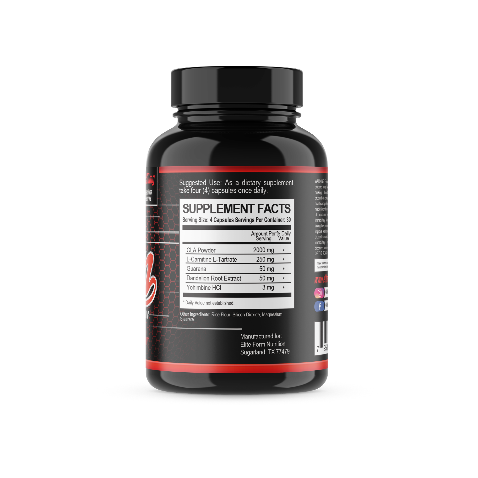 CLA & L-Carnitine L-Tartrate help to release stored fat and help tighten loose skin. Guarana & Yohimbine HCL help to increase your body’s metabolism, increasing your energy, and helping you burn more fat. Dandelion Root Extract helps to rid your body of excess water that you may be holding, increasing how lean and fit you look.